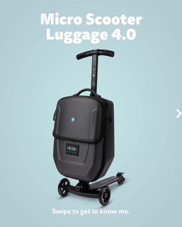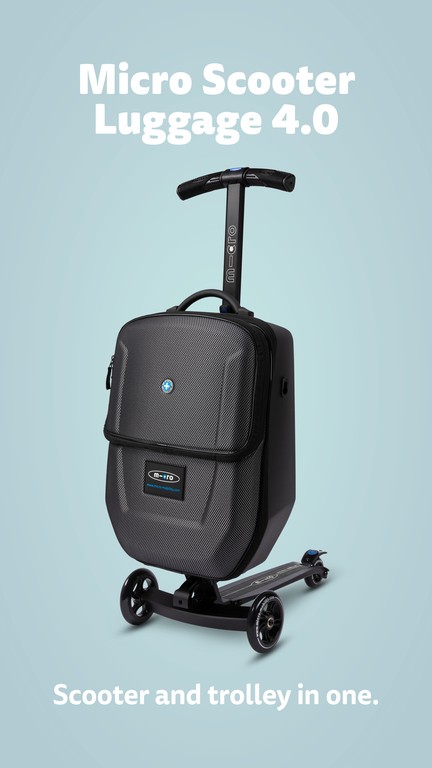 Smooth, stylish and extremely versatile: the Micro Scooter Luggage 4.0 is the perfect companion for business trips, short vacations or city life. In a matter of seconds, a simple trolley turns into a scooter that lets you glide effortlessly through the cities, train stations and airports of the world. The elegant hard-shell case with a capacity of 33 liters offers enough space foryour clothes, laptop and everything else you need to take with you. Maximum comfort is provided by the height-adjustablehandlebar, which can be optimally adjusted to your height in both trolley and scooter mode. The case can also be separated from the scooter with a simple click mechanism and can be transported with the integrated shoulder strap if necessary.Travelling has never been so easy!