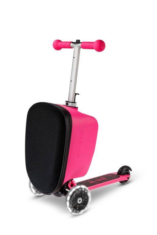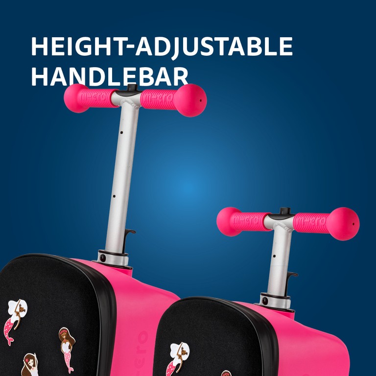 The Micro Scooter Luggage junior Patch & Play combines a children's suitcase and scooter in a unique design. It canbe ridden, pulled, and pushed - whereby pushing offers an ergonomic advantage and is gentle on the muscles and wrists. With the height-adjustable handlebar, the scooter grows with the child and accompanies them up to primary school age.