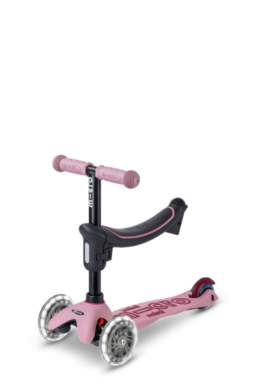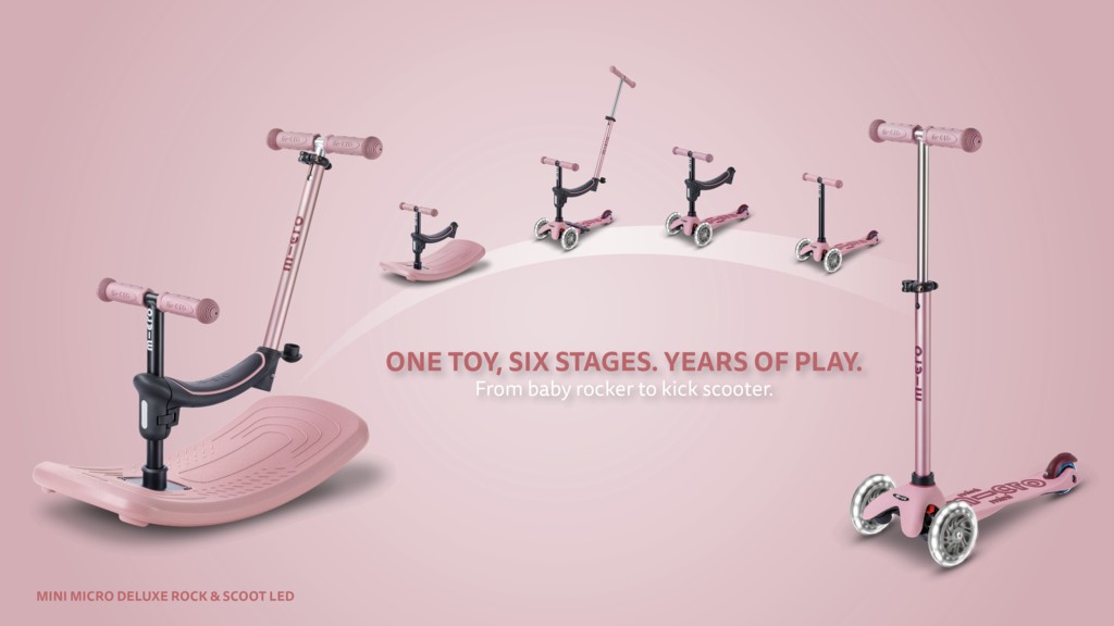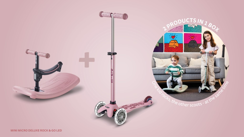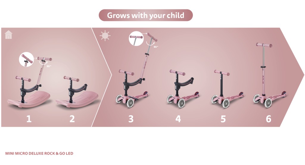 For children 1 to 6+ years old; Max Load: 20kg with seat and 50kg without seat; Three wheels for superior stability; Wheel size: 120/80mm; Wheel Material: PU; Tbar Height: 43/45-77cm; Tbar Removable, Exchangeable and Adjustable; Seat adjustable; Product Weight: 1,95-5.4 kg Available colours: Ocean Slate and Dusty Rose Patented, Swiss designMeet the Mini Micro Deluxe Rock & Go LED – the world’s first rocking scooter, cleverly combining rocking and scooting in one innovative product. Designed for children aged 1 to 6+ years, its modular 6-in-1 system grows with your child, adapting to every developmental stage – no tools required.