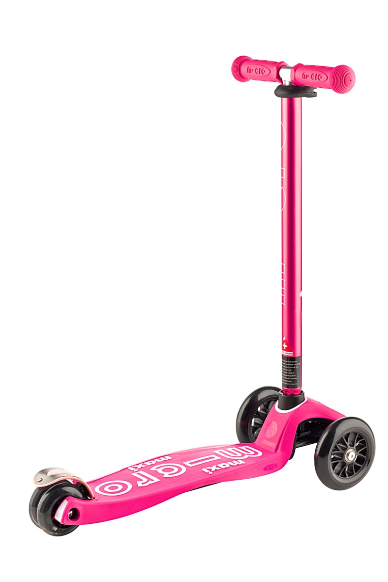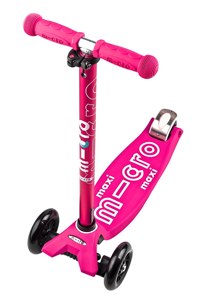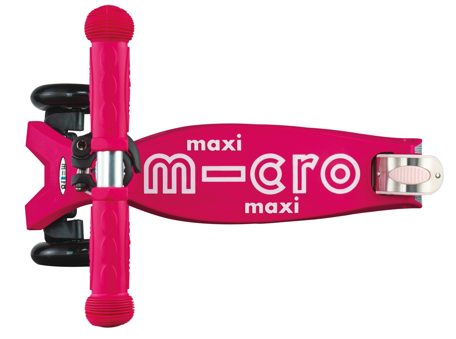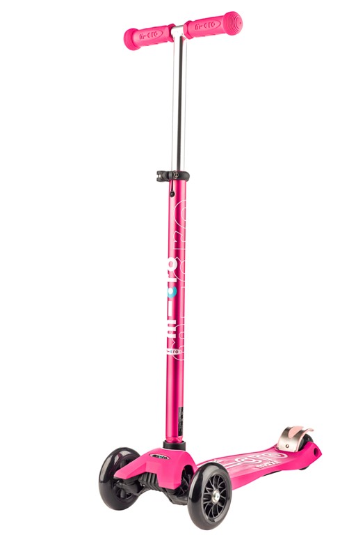 For children 5 to 12 years old Max Load: 50 kg Three wheels for superior stability Wheel size: 120/80mm Wheel Material: PU Tbar Height: 67cm - 91cm Tbar Removable and Adjustable Product Weight: 2,5 kg Available colours: Blue, Pink, Red, Green, and Purple Patented, Swiss designAdditional grip on the deck for a safer ride! The Maxi Micro Deluxe is the follow-up product to the Mini Micro, especially designed for kids who have outgrown the Mini Micro but are still too small and too light for the aluminium kickboards. The deck can carry a body weight of up to 50 kg. It only weighs 2.5 kg, therefore steering is particularly easy and you practically glide over the asphalt. The additional grip on the deck gives the rider a secure hold, and the anodised handlebar adds to the very classy appearance of the Maxi Micro Deluxe.