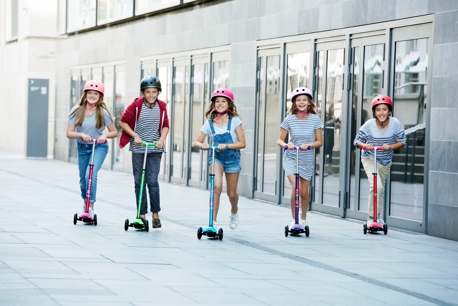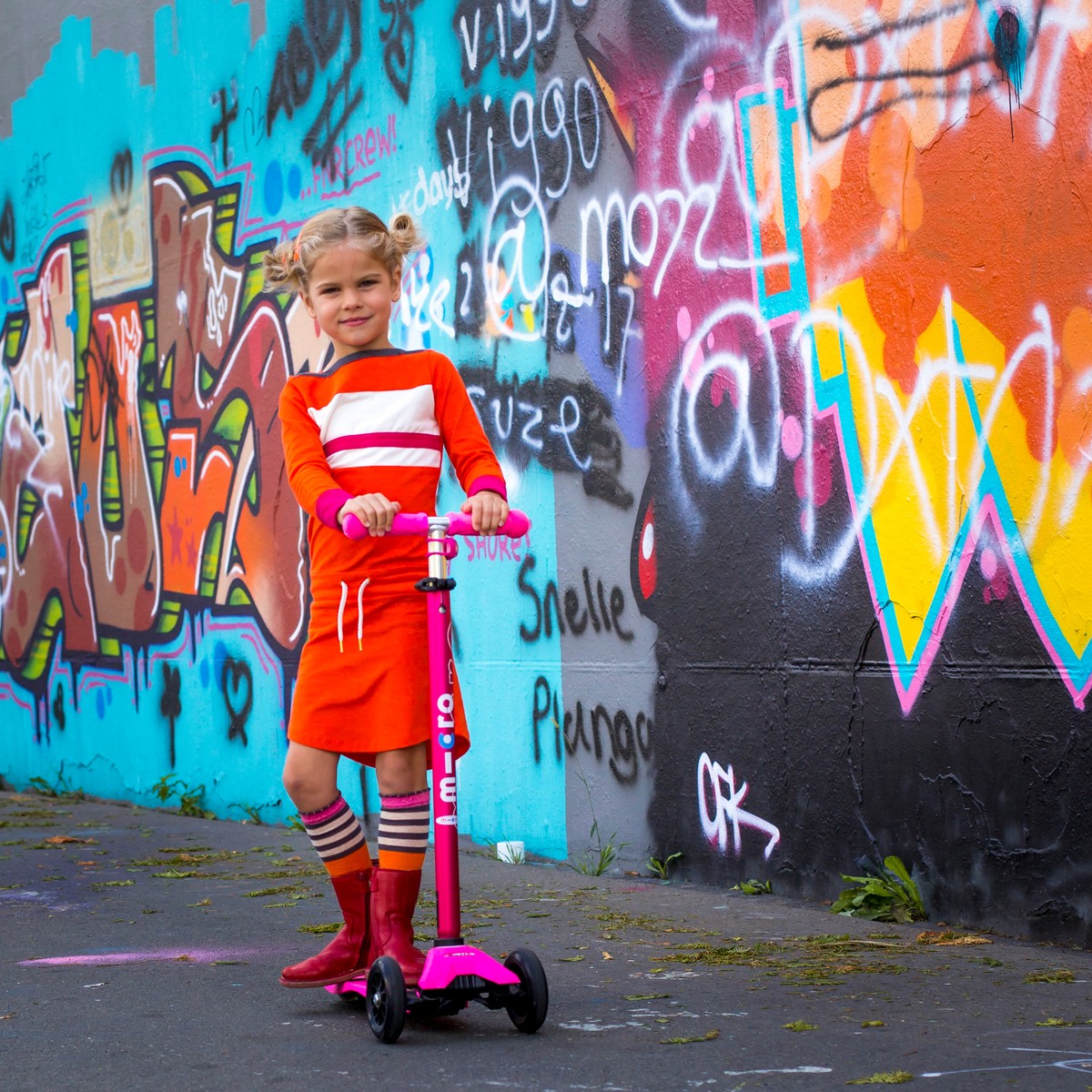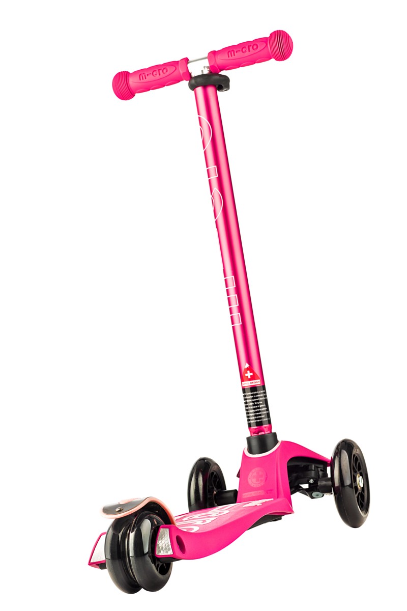 For children 5 to 12 years old Max Load: 50 kg Three wheels for superior stability Wheel size: 120/80mm Wheel Material: PU Tbar Height: 67cm - 91cm Tbar Removable and Adjustable Product Weight: 2,5 kg Available colours: Blue, Pink, Red, Green, and Purple Patented, Swiss designAdditional grip on the deck for a safer ride! The Maxi Micro Deluxe is the follow-up product to the Mini Micro, especially designed for kids who have outgrown the Mini Micro but are still too small and too light for the aluminium kickboards. The deck can carry a body weight of up to 50 kg. It only weighs 2.5 kg, therefore steering is particularly easy and you practically glide over the asphalt. The additional grip on the deck gives the rider a secure hold, and the anodised handlebar adds to the very classy appearance of the Maxi Micro Deluxe.