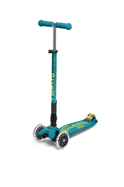 For children 5 years old + Max Load: 50 kg Three wheels for superior stability Wheel size: 120/80mm with LED Wheel Material: PU Tbar Height: 67cm - 91cm Tbar Foldable & Adjustable Product Weight: 2,8 kg Available colours: Bright Blue, Coral Pink, Volcano Grey, Berry Red, Petrol Green, Shocking Pink, Navy Blue and Red Patented, Swiss designThis Maxi Micro from the Deluxe family scores points with two extra features: Firstly, the intuitive folding mechanism ensures that the kickboard can be folded with a simple movement of the hand and stored anywhere. Whether in the boot, under the chair at school or in the locker - there is always room for the Maxi Micro Deluxe Foldable LED. Secondly, the sparkling LED wheels make sure that you can see the kids from a distance, even in the dark. The light is generated by a dynamo mechanism. Thanks to the inductive charging process, no batteries are needed. Furthermore, ABEC 9 ball bearings guarantee highest precision and durability. The illuminated wheels not only look cool but also provide more safety.
