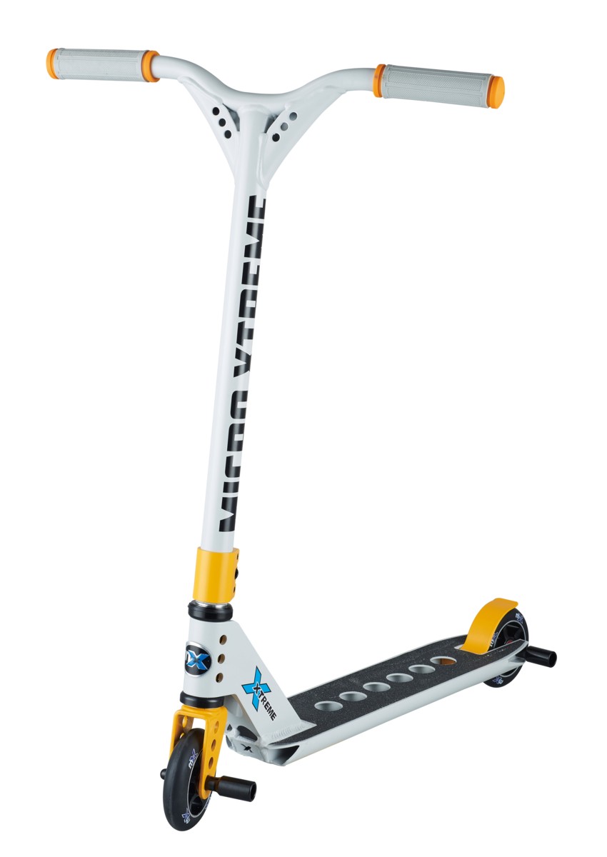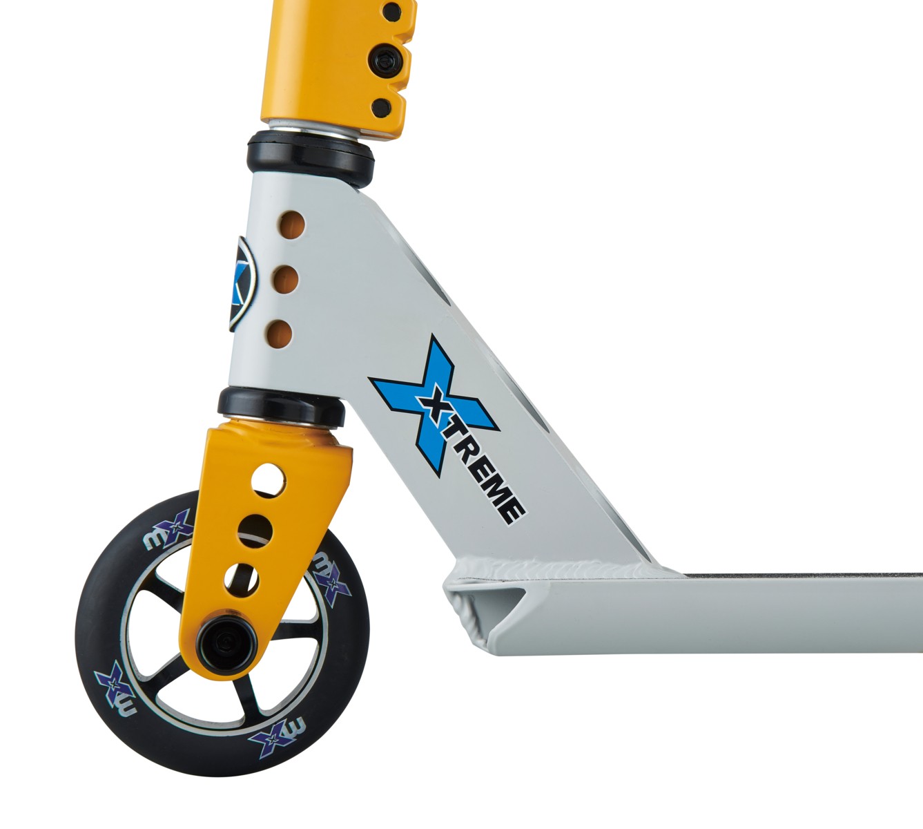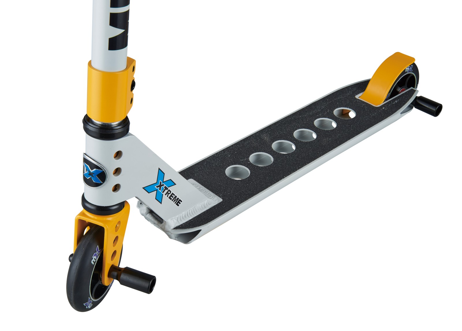 For children from 7 years old to adults Max Load: 100 kg Two wheels Wheel size: 100mm Wheel Material: PU Wheel Hardness: 88 Shore A Wheel Bearing: ABEC 9 Deck Size: 10x47cm Deck Material: Aluminium Tbar Height: 76cm Tbar Material: One piece bar in Chromoly Tbar Non-Foldable & Non-Adjustable Product Weight: 3,7kg Patented, Swiss designFor future Pro`s – basic skills are much easier! Designed with emerging riders in mind, the Trixx is the slickest scooter you could wish for to start learning some basic tricks. With its solid build and great-looking design, it’s also perfect for those riders who want to be seen at the skate park. Concave 1305 g deck and triple bolt clamp. Pegs are included.