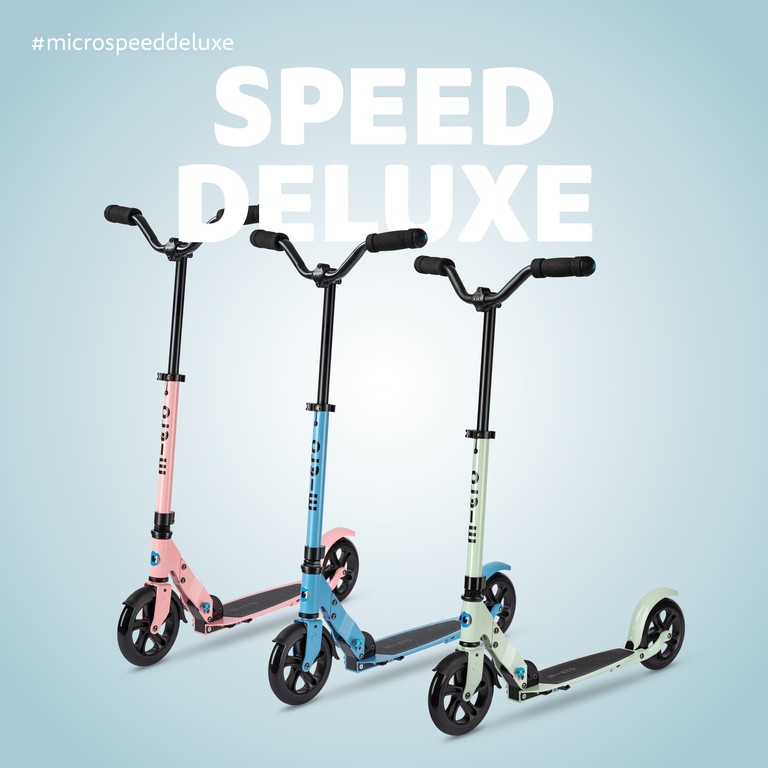 For children from 7 years old to teens and adults Max Load: 100 kg Two wheels Wheel size: 180mm Wheel Material: PU Wheel Hardness: 83 Shore A Wheel Bearing: ABEC 9 Deck Size: 120x340mm Deck Material: Aluminium, Non-slip sandpaper coating Tbar Height: 78-101cm Tbar Foldable & Adjustable Product Weight: 4,5kgThe Micro Speed Deluxe is light, agile and fast - the perfect everyday companion for teens and adults. The large wheels with a diameter of 180 millimetres ensure a smooth ride, even on rough surfaces. In addition, the trendy aluminium scooter with its cool chopper handlebar has a mudguard at the front and rear to reliably protect you from dirt and water splashes. The Micro Speed Deluxe can be stored compactly for transportation in the bus, train or car.