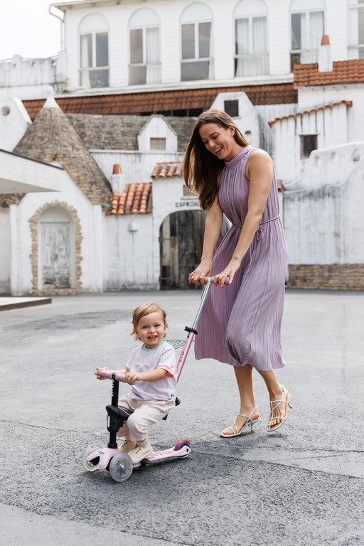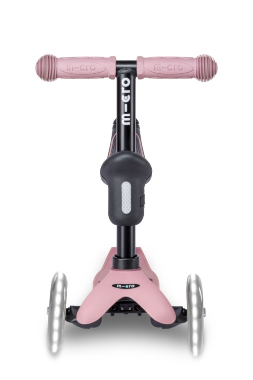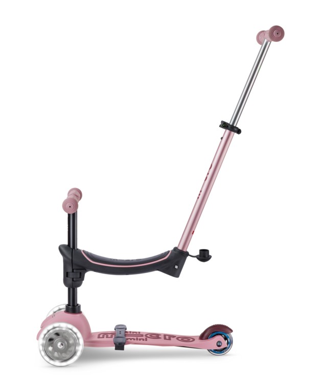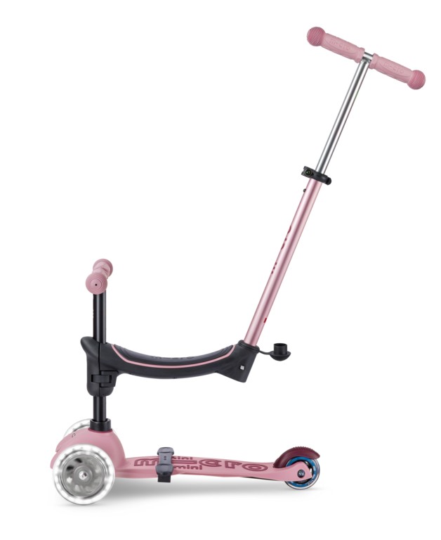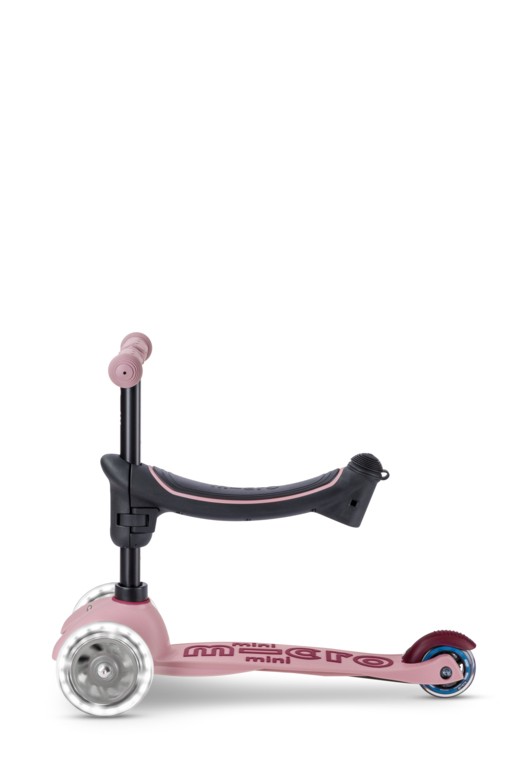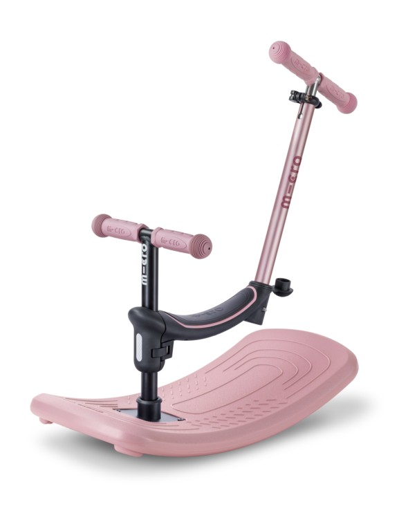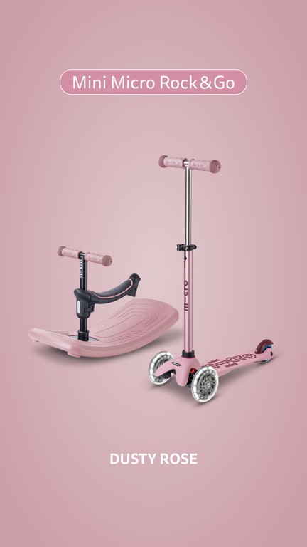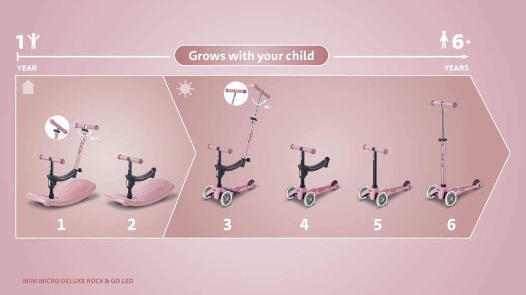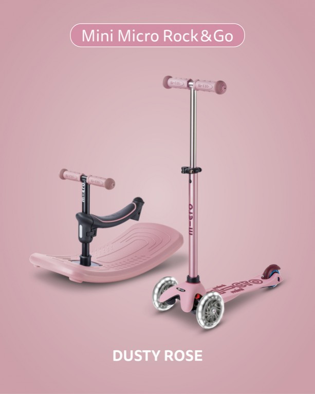 For children 1 to 6+ years old; Max Load: 20kg with seat and 50kg without seat; Three wheels for superior stability; Wheel size: 120/80mm; Wheel Material: PU; Tbar Height: 43/45-77cm; Tbar Removable, Exchangeable and Adjustable; Seat adjustable; Product Weight: 1,95-5.4 kg Available colours: Ocean Slate and Dusty Rose Patented, Swiss designMeet the Mini Micro Deluxe Rock & Go LED – the world’s first rocking scooter, cleverly combining rocking and scooting in one innovative product. Designed for children aged 1 to 6+ years, its modular 6-in-1 system grows with your child, adapting to every developmental stage – no tools required.